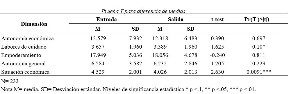 Con base en la prueba T para diferencia de medias, en la tabla anterior se observa la diferencia del promedio de las respuestas de las usuarias por cada dimensión del cuestionario de entrada en comparación con el de salida. Con base en el valor p, es posible concluir que sí hubo una diferencia en el promedio de entrada y de salida de las dimensiones “labores de cuidado” y “situación económica”. En el resto de las dimensiones, no se observa que el promedio de entrada y salida de cada dimensión haya cambiado.