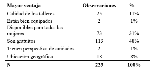 En general, el servicio y la atención que reciben en estos centros la evalúan positivamente. Consideran que la mayor ventaja es que ofrecen talleres y cursos que son gratuitos (48%), mientras que en segundo lugar destacan la disponibilidad que tiene para todas las mujeres (31%), seguido de la calidad de los talleres (11%).
