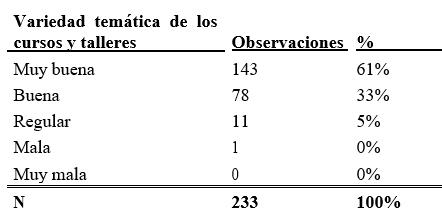 Además, el 94% de las usuarias califican la variedad temática de los cursos y talleres como muy buena (61%) y buena (33%).