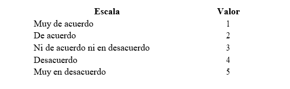 Conforme aumenta la inconformidad en la escala, aumenta el valor asignado a la respuesta; así se asignó el valor de “1” si estaban “muy de acuerdo” y 5 si estaban “muy en desacuerdo».