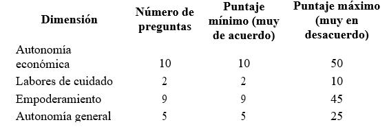 Después, los siguientes cuatro apartados refieren a 2) autonomía económica 3) labores de cuidado 4) empoderamiento de las mujeres y niñas, y 5) autonomía en general. Estas cuatro secciones utilizan una escala Likert para evaluar qué tan de acuerdo o en desacuerdo están con las afirmaciones correspondientes a cada apartado.