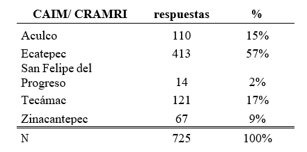 Del cuestionario de entrada se obtuvieron 725 respuestas. En la tabla a continuación, se muestra cómo la mayoría de las respuestas de los cuestionarios (57%) corresponden al centro de Ecatepec, mientras que el 17% al de Tecámac, 15% al de Aculco, 9% al de Zinacantepec y solo 2% al de San Felipe del Progreso.