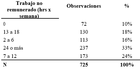 El 33% de las usuarias le dedican 24 horas o más al trabajo no remunerado a la semana. Esta cifra también es similar al número de horas no remuneradas que trabajan las mujeres a nivel nacional (27 horas). No obstante, el 66% de las usuarias que participan en los CAIMs y CRAMRIs invierten menos horas en trabajo no remunerado que el promedio de las mujeres a nivel nacional. Este hallazgo es consistente con el objetivo de los talleres que es lograr el auto empleo. Por tanto, entre menos horas le dediquen al trabajo no remunerado tienen más tiempo para dedicarlo al trabajo remunerado.