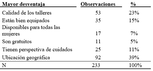 En general, el servicio y la atención que reciben en estos centros la evalúan positivamente. Consideran que la mayor ventaja es que ofrecen talleres y cursos que son gratuitos (48%), mientras que en segundo lugar destacan la disponibilidad que tiene para todas las mujeres (31%), seguido de la calidad de los talleres (11%).