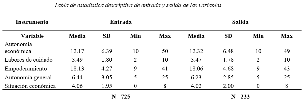 Con base en la prueba T para diferencia de medias, en la tabla anterior se observa la diferencia del promedio de las respuestas de las usuarias por cada dimensión del cuestionario de entrada en comparación con el de salida. Con base en el valor p, es posible concluir que sí hubo una diferencia en el promedio de entrada y de salida de las dimensiones “labores de cuidado” y “situación económica”. En el resto de las dimensiones, no se observa que el promedio de entrada y salida de cada dimensión haya cambiado.