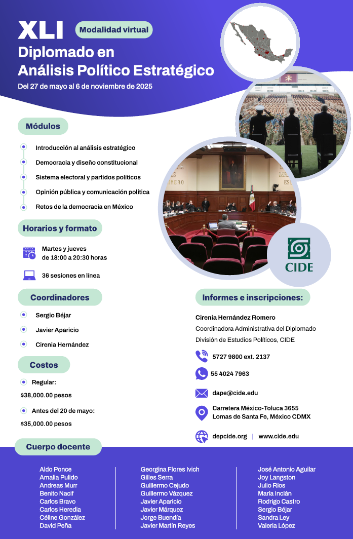 El Diplomado en Análisis Político Estratégico, organizado por la División de Estudios Políticos del CIDE desde el año 2000, es el programa especializado en análisis político más consolidado del país y en esta XLI edicion se realizará en modalidad virtual. Nuestro cuerpo docente consta de académicos de diversas instituciones y disciplinas sociales con una sólida formación, así como de especialistas en la materia electoral y judicial, que son dos aspectos claves de las reformas constitucionales más recientes y la próxima elección judicial.
