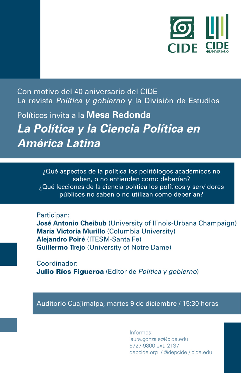 Con motivo del 40 aniversario del CIDE, la Revista Política y Gobierno y la División de Estudios Políticos tienen el agrado de invitarlos a los siguientes eventos el martes 9 de diciembre: